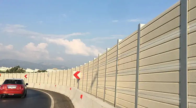 The purpose of building a sound barrier at Izmir Airport Junction is to eliminate the noise. On the other its objective is preventing the propagation of sound waves due to being a waterproof system, at the same time reduces the heavy traffic noise on the Izmir airport route. Usk-single-sided aluminum noise barriers are manufactured from recycled materials, they are materials with high absorption properties as well. Aluminum sound barriers absorb sound waves and reverberation decreases. Our noise barriers protect regions from sound waves.